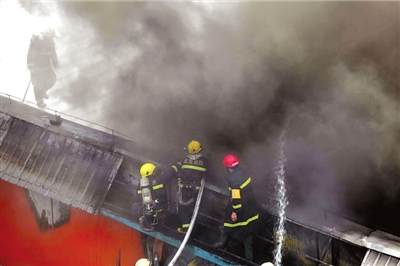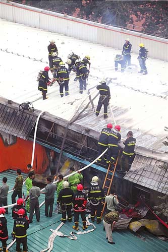 采石路消防中隊和首體南路消防中隊出動10輛消防車相繼趕到,消防員向屋頂噴水后,攀上樓頂鑿開屋頂彩鋼板向內(nèi)噴水。很快,明火被撲滅。消防員需一人指引進入教室,小石便自告奮勇領路。小石說:“教室有一個籃球場大,里面有音響設備和椅子等物,當時屋內(nèi)濃煙滾滾。”他隨即撤出,消防員繼續(xù)進行撲救。