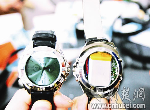 “竅門(mén)在這里!惫ど倘藛T把手表后蓋揭開(kāi),里面多了一塊微型電路板和芯片。原來(lái),這是一套短信接收裝置,收到短信后,還可以存儲(chǔ)在手表中。
