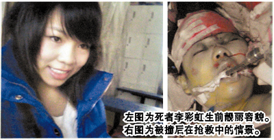 去年12月26日凌晨,湖南打工妹李彩虹離開工作的酒店返回宿舍,誰料走到花都區(qū)新華街與商業(yè)大道的交叉口時,一輛紅色寶馬Mini小轎車飛馳而過,將她撞死。駕車人是廣東外語外貿(mào)大學(xué)大三學(xué)生任偉煒。兩人是同齡人,當時都只有21歲。肇事者任偉煒當即駕車逃逸,至今未歸案。