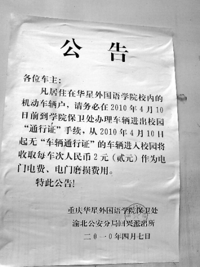 “我們住戶和學(xué)校完全是兩個(gè)獨(dú)立個(gè)體,學(xué)校根本沒有任何權(quán)力向我們收費(fèi)!奔易∪A星外國語學(xué)院家屬樓1單元5樓的住戶龍兵生說,本月7日,學(xué)校保衛(wèi)處在大門口通報(bào)欄處貼了一則收費(fèi)公告,要求凡居住在校內(nèi)有機(jī)動(dòng)車輛的住戶務(wù)必在本月10號(hào)前到學(xué)院保衛(wèi)處辦理進(jìn)出“通行證”手續(xù),否則將向進(jìn)出校園的無“車輛通行證”的住戶,收取每人每車次2元,作為電門電費(fèi)、電門磨損費(fèi)用。