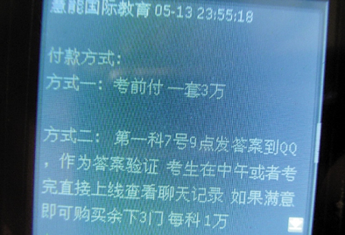 稍早前,徐杰在一個頗有人氣的高考吧里發(fā)帖時被賣“高考答案”的人盯上了,這個叫“慧能國際教育”的QQ號,其簽名檔寫著:“高考考前答案已發(fā)出,請各位客戶收到后立即回復(fù)索取解鎖密碼!”徐杰說,對方開門見山告訴他,能搞到今年高考試題答案,而且是第一手的。為了讓徐杰相信,賣家稱第一科可在7日上午9時發(fā)答案到其QQ上,作為答案驗(yàn)證,考生在中午或考完直接上線查看聊天記錄,如果滿意,可購買余下幾門考題和答案,每門1萬元。如果考生在考前付錢,全套3萬元,考題和答案會在考前一天下午2時準(zhǔn)時發(fā)到其郵箱(見右圖)。賣家還聲稱,考卷是掃描版的,答案是特級教師和高級教授做出的,準(zhǔn)確率在95%以上。按照賣家的說法,只要花重金,考生“包二本以上力爭一本”,就可讀上理想中的大學(xué)。