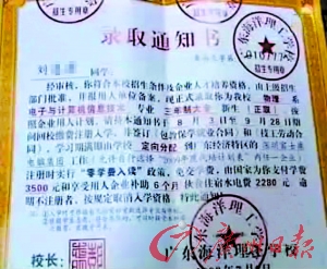 記者發(fā)現(xiàn),這些發(fā)出錄取通知書的學(xué)校,全部都提出各種各樣令人心動(dòng)的優(yōu)惠條件。像某學(xué)校的錄取通知書上就寫著“零學(xué)費(fèi)入讀”以及“享受用人單位補(bǔ)助的各種優(yōu)惠政策”。明眼人一看,就知道這些錄取通知書很可疑。