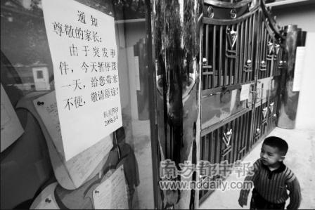 在公開信的邊上還貼著一份機(jī)關(guān)四幼的通知,稱“由于突發(fā)事件,今天暫停課一天”。在這份通知的左下角,有人用圓珠筆歪歪扭扭地寫下了不滿:“家長(zhǎng)要求退還所有費(fèi)用,到其他學(xué)校上學(xué)!