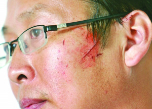 昨天,記者在新集中學(xué)見到陳宏濤,他的左耳上部腫得老高,顴骨處有一道約兩寸長(zhǎng)的傷口,鼻梁處也有幾道血口子。