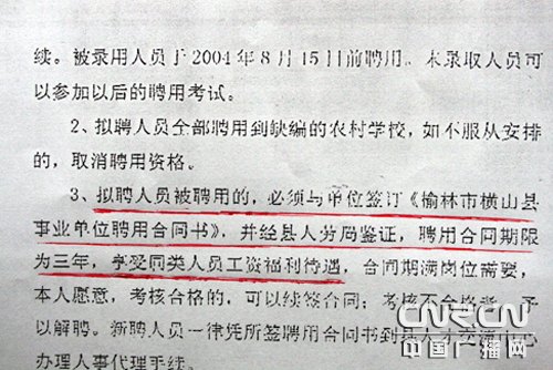 雷波說,他參加工作后,日子越過越窮,孩子感冒都不敢去醫(yī)院治療。類似雷波的遭遇,在180名選聘教師的每個(gè)人身上都上演著。從4月2號(hào)開始,這些教師紛紛丟下學(xué)生,到橫山縣人民政府討說法。橫山縣人事和勞動(dòng)社會(huì)保障局辦公室的工作人員稱,當(dāng)初的考試是為解決中專生就業(yè)而進(jìn)行的,雷波等人屬于民辦教師,難以做到與中專生同工同酬。
