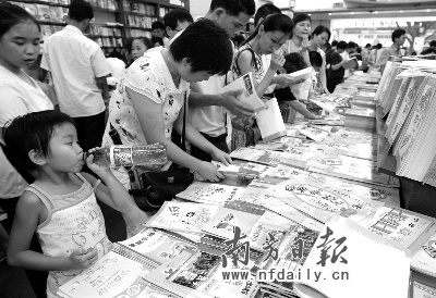 在廣州購書中心二樓,家在白云區(qū)的曾先生手里拿著一張清單,上面是準(zhǔn)備升讀五年級的女兒手抄的各科必備輔導(dǎo)書,“老師指定的,全班必須要買同一種!痹壬f。但是,他在購書中心轉(zhuǎn)了大半天,還是沒有找到指定的那本語文輔導(dǎo)書,顯得很無奈。據(jù)了解,每年開學(xué),曾先生都肩負(fù)著為女兒找書的重任,為求一本“指定教輔”,奔走于各大書店。曾先生告訴記者,曾經(jīng)為了購買女兒的一本練習(xí)冊,全家人都出動了,從白云區(qū)一直跑到位于黃埔區(qū)的購書中心分店才找到。