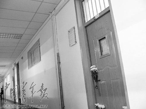 照片:教室門(mén)口擺放著吊唁的白色鮮花。 本報(bào)記者 王國(guó)強(qiáng)攝