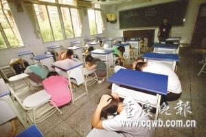 “由于發(fā)生余震,請同學(xué)們迅速疏散,到操場集合!”昨下午3時50分,一場特殊的高考防震演習(xí)在重慶市八中第二教學(xué)樓舉行。200多名高一學(xué)生在聽到廣播發(fā)出的指令后,快速從教室跑到操場上,整個過程用時不到兩分鐘。