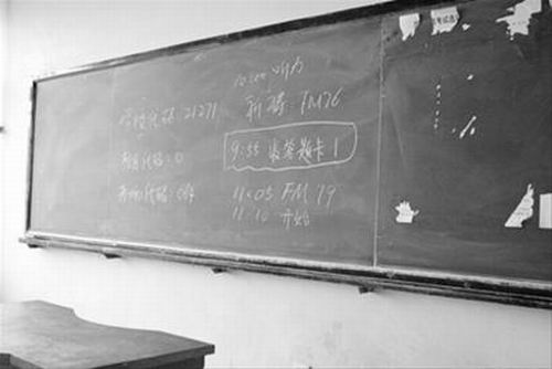 事發(fā)考場內(nèi)的黑板上還寫著重新定的考聽力的時(shí)間和波段。 記者 陳浩 攝