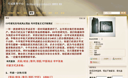 據“傳播小王子”反映,這些販賣試題的廣告不僅在各大考研論壇上蔓延,而且在QQ群、百度貼吧等處也是層出不窮,甚至有人開博客公然叫賣。而服務的種類從考前一天提供考試答案到考場中“在線服務”不一而足。