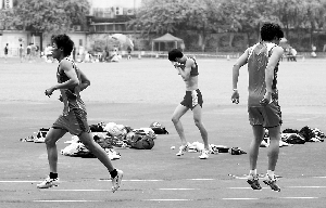 記者昨日一早看到,廣州體育學(xué)院數(shù)千平方米的體育場(chǎng)外,家長(zhǎng)和帶隊(duì)老師只能遠(yuǎn)遠(yuǎn)的依附在體育場(chǎng)邊的欄桿上觀望,那一雙雙期待的目光著實(shí)令人感動(dòng)。今年首次承擔(dān)全省高考體育術(shù)科考試的廣州體育學(xué)院,考場(chǎng)的監(jiān)管格外嚴(yán)格,體育場(chǎng)的各個(gè)關(guān)口都站立著工作人員,除考生和考官外,任何人不得進(jìn)入場(chǎng)內(nèi)。記者試圖持證進(jìn)入,也被毫不留情地請(qǐng)出場(chǎng)地。