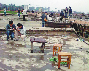 3月 28日上午,是今年全國(guó)計(jì)算機(jī)考試的筆試時(shí)間,據(jù)該學(xué)員說,老師考前讓每名考生帶一位親友,統(tǒng)一在學(xué)校教室集合。筆試開始幾分鐘后,教室里的老師便得到了考題。老師在黑板上一行行地寫出了:1-5324431-641423……人們紛紛拿出手機(jī)(見上圖)。20多分鐘后,這名老師擦去黑板上的字,急急離去。由于朱洪學(xué)校當(dāng)天參加筆試的約有幾百名學(xué)員,從教室里到外面空地,忙著發(fā)送短信的考生親友隨處可見(見下圖)。該知情者說,那名老師寫在黑板上的 “32443”分別代表著“CBDDC”,這些“數(shù)字”和隨后寫出的“漢字”,便是筆試中的“選擇題”和“填空題”的答案。