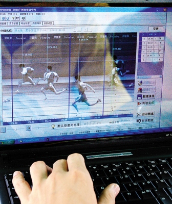 在五中的200米跑賽道上,起點處多了兩個黑盒子,終點處則有一個高臺,一個攝像鏡頭時刻對準(zhǔn)終點線,當(dāng)學(xué)生們沖過鏡頭前的一剎那,高臺上的工作人員就可以從電腦上看到清晰的沖線照片!捌鹋芫的兩個黑盒子其實是傳感器,當(dāng)學(xué)生過線時,通過電磁波發(fā)射,令電腦系統(tǒng)開始計時,”操作電動計時儀的工作人員告訴記者,“終點線前的高速攝影機(jī)可以精確到1/1000秒,拍出非常精細(xì)的圖像,讓每個學(xué)生的成績誤差降到最小!