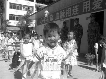 “好漂亮的鋼琴!媽媽,這下我可以學(xué)唱歌跳舞啦!”昨日上午,彭州市龍門山鎮(zhèn)上傳出孩子們興奮的叫聲,一雙雙小手在嶄新的板房?jī)?nèi)四處摸索。這是5·12地震后,四川災(zāi)區(qū)建起的第一個(gè)“五星級(jí)”板房幼兒園。廣州空軍平日里修建機(jī)場(chǎng)、跑道的工程師們,連續(xù)奮戰(zhàn)7個(gè)晝夜,在廢墟旁為150名孩子重新建起了樂(lè)園。