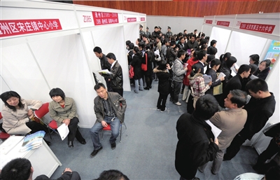 昨天,近幾年來本市首場中小學(xué)教師專場招聘會在首師大體育館舉行,1.3萬名北京高校應(yīng)屆畢業(yè)生蜂擁而至,競爭132家本市中小學(xué)提供的1100余個崗位。在招聘現(xiàn)場,市區(qū)學(xué)校攤位前人頭攢動,而郊區(qū)學(xué)校則門可羅雀,兩極分化嚴(yán)重。