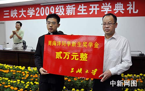 開學典禮上,三峽大學校長李建林為5名新生頒發(fā)錄取通知書,三峽大學黨委副書記何偉軍為周海洋頒發(fā)了2萬元新生獎學金。隨后,周海洋作為新生代表發(fā)言,他說,自己是懷著感恩的心態(tài)進入三峽大學的,站在新的人生起點,他最大的希望是4年內(nèi)學有所成,以此報答學校的培養(yǎng)和家人的厚望。周海洋的發(fā)言不似他的文章那般酣暢淋漓,而是顯得有點語無倫次,他多次表示是由于太激動的緣故。