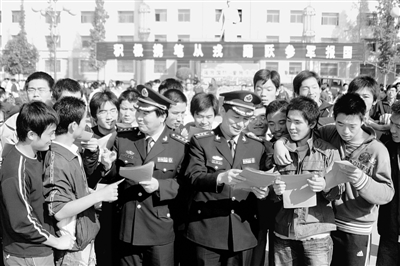 13萬大學生進軍營,是在一個特殊的背景下提出的。今年3月5日,十一屆全國人大二次會議上,國務院總理溫家寶在政府工作報告中明確提出,高校畢業(yè)生可“到農村基層服務和參軍入伍”。為鼓勵高校畢業(yè)生攜筆從戎,教育部、財政部、總參謀部等部門專門出臺了八項優(yōu)惠政策。這些舉措,充分體現(xiàn)了國家對應屆大學畢業(yè)生的關懷。但是,軍隊敞開大門征召大學畢業(yè)生的意義和作用,不僅僅是為了單純地緩解社會就業(yè)壓力,更蘊含一個深刻的時代主題。