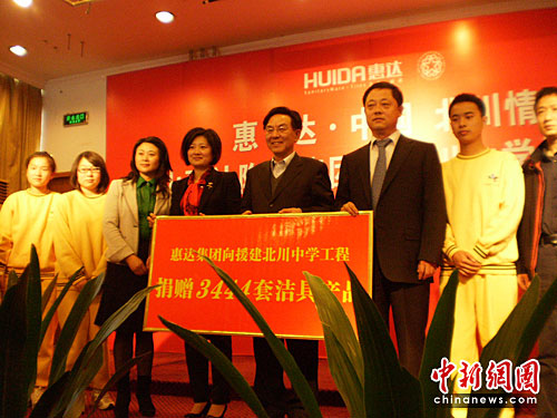 中新網(wǎng)綿陽4月19日電 (徐楊祎)“從唐山到北川,盡管路途遙遠(yuǎn),但我們的心是貼在一起的!19日下午,唐山惠達(dá)集團(tuán)執(zhí)行董事總經(jīng)理王彥慶在北川中學(xué)捐贈儀式上說到。本次捐贈是由唐山惠達(dá)集團(tuán)向即將落成的新北川中學(xué)捐贈百萬的節(jié)水潔具。