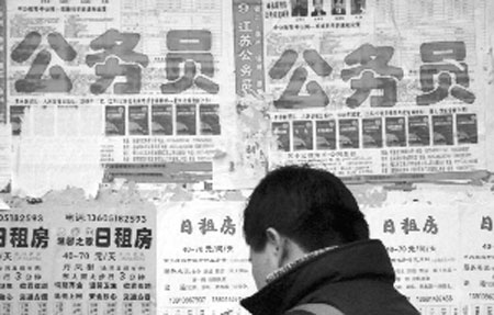昨天,記者從南京幾所高校校內(nèi)信息公告欄里看到,公務(wù)員考試輔導(dǎo)班大有風(fēng)頭蓋過考研輔導(dǎo)班的趨勢(shì),連學(xué)生宿舍樓門口、餐廳門口公告欄上,也張貼著公務(wù)員考試輔導(dǎo)的招生海報(bào)。