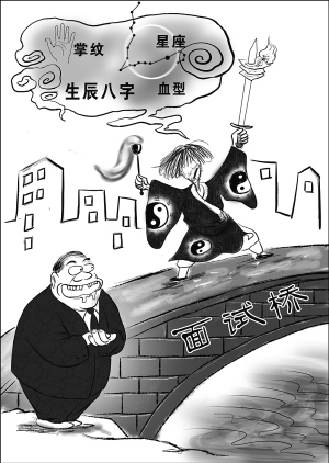 找工作面試,要先經(jīng)“相面先生”看面相看掌紋;能否錄用,要由血型說了算;是否適合職位,得計(jì)算一下星座和生辰八字再說。過了“金九銀十”的網(wǎng)上申請、網(wǎng)上投簡歷高峰,11月起應(yīng)聘面試進(jìn)入高峰期,不少求職者在面試中屢屢遇到新招怪招,讓人“看不懂”。