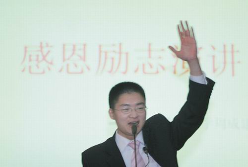 昨日下午4點(diǎn),記者在重慶八中禮堂見(jiàn)到了正在做勵(lì)志演講的西政經(jīng)貿(mào)法學(xué)大四學(xué)生周成建。演講臺(tái)上,周把自己的人生經(jīng)歷、奮斗經(jīng)歷編織成故事講給中學(xué)生聽(tīng)。