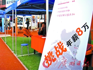 “據(jù)我所知,從沒有人搞這種嘗試,”小莫自信地說,“擺攤”之前,他曾經(jīng)對設(shè)計類學(xué)生的就業(yè)情況做了一番了解,發(fā)現(xiàn)招聘單位以小企業(yè)居多,“首先從工資上,就感到小企業(yè)對設(shè)計并不重視,”他說,很多小企業(yè)都打出1000~2000元每月的工資,所以他執(zhí)意打出“年薪8萬”的要求,也是想提起企業(yè)單位對設(shè)計的重視。