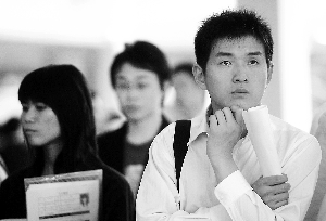 昨日的招聘會是金融營銷類專場,以往備受學生追捧的“金飯碗”昨日卻令不少求職者感到“當頭一棒”!霸缟8點我就過來了,已經(jīng)投了4家,但都不是很滿意,銀行招聘的好像只有興業(yè)銀行一家!痹谡衅笗F(xiàn)場,記者遇到廣東金融學院金融專業(yè)大四學生小玉,他說自己的愿望就是到銀行工作,但因為金融危機的影響,銀行招聘正在“壓縮”,不僅崗位少了,條件也苛刻了許多,例如對年齡有了限制,“大學本科生年齡不超過24歲,碩士研究生年齡不超過28歲”。