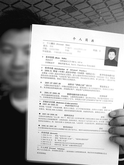 “家教、發(fā)單員……這些兼職可能都是‘大路貨’”,于是,他刪掉了這些毫無(wú)特點(diǎn)的經(jīng)歷,并按重要程度把簡(jiǎn)歷分層次,又將自我評(píng)價(jià)改用實(shí)例支撐。他花了兩個(gè)月,作了近70次修改,將厚厚一沓簡(jiǎn)歷精簡(jiǎn)到一張紙。