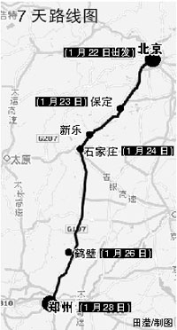 由于沒有買到回老家鄭州的火車票,北航的大二學(xué)生高富松決定騎自行車回家。他1月22日從北京出發(fā),歷時7天抵家,目睹了冰雪對沿途居民的影響。昨天,高富松興奮地告訴記者,雖然路上經(jīng)歷了不少困難,但堅持到最后的精神讓自己平安到家,而且這次經(jīng)歷也考驗(yàn)了自己的耐力。