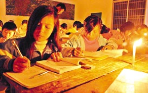 昨天(19日)下午6時40分,16歲的陳麗娟與同學(xué)們照例走入課室,從老師手中接過一支蠟燭點燃,當(dāng)晚,連州市西江鎮(zhèn)中學(xué)600多學(xué)生在點點燭光中,迎來了2008年新學(xué)期的第一個晚自修。