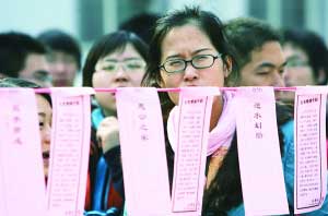 人大信息技術(shù)學(xué)院的李同學(xué)在一條“比干緣何落馬死,勾踐因此可吞吳”的謎語前苦思冥想。他說,對于學(xué)理工科的學(xué)生來說,猜字謎更容易些,在成語和典故這樣的謎語前有難度。