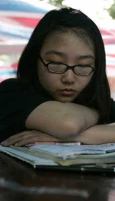 書是從廢墟中和同學(xué)處湊出來(lái)的,書桌是從帳篷鄰居那兒借來(lái)的。張亞秋理解廣播里傳出災(zāi)區(qū)消息的巨大聲音,也理解來(lái)來(lái)往往為賑災(zāi)的車輛,她只是每天抓緊僅有的時(shí)間,盡力讓自己沉浸到復(fù)習(xí)環(huán)境中去!耙郧懊刻炱唿c(diǎn)半開(kāi)始早自習(xí),晚上復(fù)習(xí)到11點(diǎn),現(xiàn)在6點(diǎn)鐘就起床,下午4點(diǎn)左右就不能看書了!睆垇喦镎f(shuō),下午4點(diǎn)以后,天色變化很快,光線已經(jīng)不能再看書。