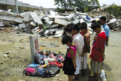 楊濤是張帥最好的同學(xué),看著他的書包,張帥不禁失聲痛哭。他告訴記者,地震發(fā)生時他從3樓被甩下來,埋在一片廢墟里,右手小指一截被當(dāng)場砸斷。他奮力爬了出來,這時他突然看到同班同學(xué)楊濤的頭被一塊預(yù)制板砸破,鮮血直流,他過去搖了搖,楊濤沒有動,他使勁拉了拉,還是沒動。后來他和警察一道把楊濤救了出來,但楊已身亡。