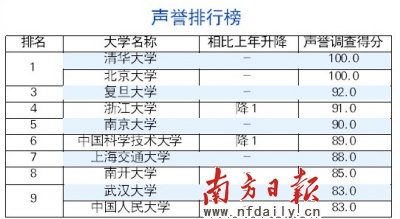 雖然清華和北大的地位難以撼動,但在綜合榜單中,第三到第十名的位置還是處于一種“動態(tài)的平衡”中,去年排名第五的浙江大學(xué)超越了南京大學(xué)和復(fù)旦大學(xué),躍居第三,中國科學(xué)技術(shù)大學(xué)、南京大學(xué)、復(fù)旦大學(xué)、上海交通大學(xué)、北京師范大學(xué)、哈爾濱工業(yè)大學(xué)、南開大學(xué)、中國人民大學(xué)(含并列)依次排名第四至第十。去年排名第十的中山大學(xué)今年排名第18。