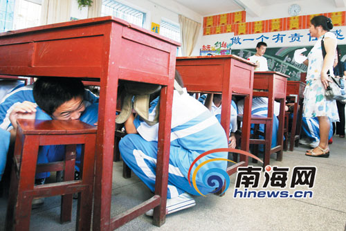 為訓(xùn)練學(xué)生的逃生能力,現(xiàn)場進行了一次“鉆桌子”演習(xí),老師在講臺上發(fā)出號令,學(xué)生們聽令“鉆桌子”,這個班有66人,在演習(xí)過程中,學(xué)生們感到這么做很好玩,一個個樂不可支,在鉆桌子的過程中,有幾個學(xué)生笑得坐倒在地上,有的學(xué)生“顧及形象”不愿往桌子下鉆,只是蹲在地上,用一本書擋在頭上。老師發(fā)令“往外跑”時,學(xué)生們一邊笑一邊跑,跑到走廊上時,仍然笑聲不絕。