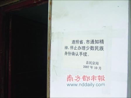 在民宗局辦公室的門口處,張貼著落款為“2007年10月”的一份告示,“遵照省、市通知精神,停止辦理少數(shù)民族身份確認(rèn)手續(xù)!迸砹f(shuō),這是因?yàn)檎宜齻冝k民族變更手續(xù)的人很多,“很煩,就在門口貼了這張公告。”