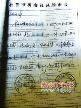 7月18日下午,石首市繡林辦事處槐樹堤居委會(huì)辦公室張會(huì)計(jì)回憶,2006年7月25日,一名婦女曾找到她,請(qǐng)居委會(huì)開具一份證明,這名婦女還找來(lái)了一位熟人,以證明她的身份。由于有熟人介紹,她便蓋了公章。
