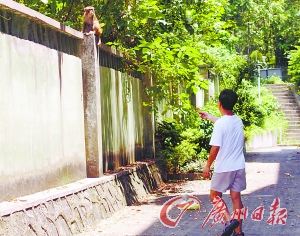 廣東外語外貿(mào)大學(xué)校園東北角是幾棟教工宿舍,隔著圍墻,外面就是郁郁蔥蔥的白云山!按蟾5天前,我看到墻頭上蹲著一只猴子,就回屋拿香蕉過來逗它。它盯著香蕉,又看了我?guī)籽,之后溜下圍墻跳到我身邊,用前爪拍拍我的腿?此蓱z,也多少有點(diǎn)害怕,我把香蕉扔給它,它就自己剝開香蕉吃了!弊≡谶@里的鄭叔告訴記者,這是一只成年猴,個(gè)子有70厘米左右,樣子很可憐,一點(diǎn)也不兇!拔以谶@里住了三十多年了,還頭一回看到猴子下山。”