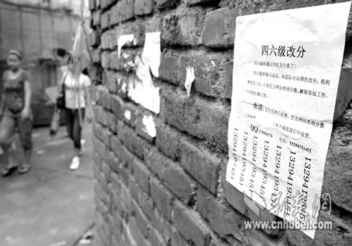 昨日上午,記者接到武昌某大學(xué)學(xué)生的投訴,稱又有人在學(xué)校附近張貼了“四六級改分”的廣告單。記者前往采訪見到,廣告標(biāo)稱可“解除你找工作、升學(xué)的后顧之憂”,并留下了聯(lián)系電話和QQ號碼,不時引來學(xué)生觀看(如圖)。