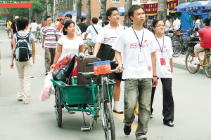 天津大學(xué)“新生報(bào)到處”所在的教學(xué)樓門(mén)前,整整齊齊地停著一排面包車(chē)、小貨車(chē),每輛車(chē)上都貼著“迎接新生專(zhuān)用車(chē)”等標(biāo)志。新生登記后,高年級(jí)志愿者就會(huì)幫他們將隨身行李裝上汽車(chē)。能容納五六個(gè)人的面包車(chē)塞下行李之后,載上新生一家三口,一般就再也擠不下人了。從老師們口中得知,僅僅昨天上午,他們就在兩地往返了二三十次。