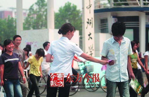 上午11時,發(fā)放點移到中州大學和鄭州師專門口,正在報名的學生和家長明顯增多,看到計生人員發(fā)宣傳資料,很多學生主動圍了上來。