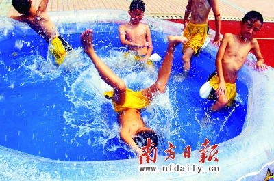 開學(xué)當(dāng)天,“汶川班”學(xué)生下課后,在充氣型游泳池里玩得不亦樂乎。