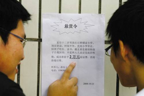 昨日中午,記者來到工商大學(xué),在該校男生宿舍二幢樓外看到這則“懸賞令”,內(nèi)容為:“家有12歲男孩在石橋鋪某小學(xué)讀書,現(xiàn)征陪讀,時間半年,直到小學(xué)畢業(yè),陪孩子吃、住、讀書,最關(guān)鍵的是要能扭轉(zhuǎn)孩子自我封閉,不愛和大人說話交流的性格,成功者給予2萬元陪讀費(fèi),否則只付車費(fèi)!