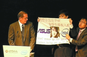 昨日(10月29日,下同),英特爾(Intel)總裁兼CEO歐德寧在北大演講時(shí),華碩天價(jià)索賠案主角之一周成宇忽然沖上臺(tái),舉牌抗議英特爾與華碩聯(lián)合陷害黃靜,隨后被保安架離會(huì)場(chǎng)。周成宇事后稱,此舉是“為黃靜討個(gè)公道”。