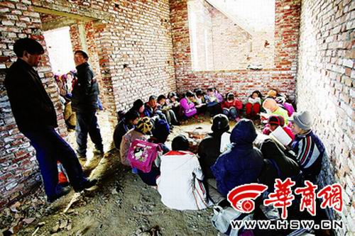 上午10時許,距董廟小學200米的地方傳來讀書聲。這是剛砌好不久的磚房,沒窗也沒門,學生分別待在幾個房間里,四下漏風,穿棉襖還是冷,大家圍成圈不停地跺著腳。老師用磚搭個簡易爐,燒些樹枝讓大家能感覺點暖意!斑@種地方的確不能上課,總不能耽誤學業(yè),只好先找個地方解決了!崩蠋熣f。