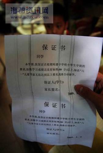 對(duì)于他兒子的說(shuō)法,王先生予以證實(shí)。他說(shuō),已有學(xué)生家長(zhǎng)交上簽好名的保證書(shū),當(dāng)時(shí)校方叫他簽字時(shí),他婉拒了。“孩子受教育應(yīng)該是平等的,不應(yīng)以學(xué)習(xí)成績(jī)來(lái)區(qū)別,這兩天孩子一直悶悶不樂(lè),可能此事已傷到他的自尊心了。”王先生說(shuō)。