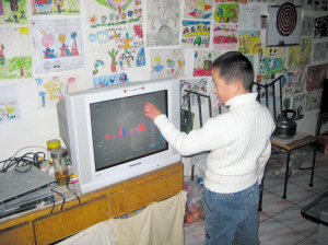 記者日前一進小信信家,就被客廳四周貼滿了的畫吸引住了:有飄著鮮艷的五星紅旗的遠洋艦;有活潑可愛的兩只大熊貓;有遨游在大海的快樂魚兒。一臺電視機正在播放股市行情的節(jié)目,小信信則聚精會神地觀看著,并很專業(yè)地向記者講解與分析(見圖)。