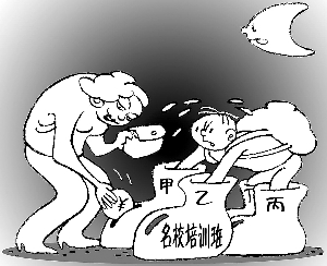 “這幾年為孩子報(bào)各種班可沒少花錢!备窀駤尨炙懔艘幌,僅在“巨人”的英語班從去年暑假到今年寒假就花了8000多元,加上“學(xué)而思”的奧數(shù)班,還有目標(biāo)校的“占坑”班,這兩年加起來花了25000多元。目標(biāo)校培訓(xùn)班,一個(gè)學(xué)期1000多元,一年就是2000多元,每個(gè)班30多個(gè)孩子,13個(gè)班左右,目標(biāo)校的培訓(xùn)班一年就能收78萬元,民間機(jī)構(gòu)辦的班、收的費(fèi)就更多了。