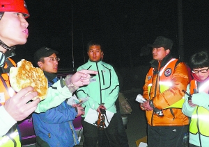 昨天晚上,當(dāng)記者來(lái)到北京市植物園西門的時(shí)候,門旁邊的花池子邊上,放著救援隊(duì)員帶來(lái)的烙餅、鴨脖子、雞腿,還有成箱的礦泉水,下午4時(shí)出發(fā)前兩組隊(duì)員剛剛返回,很多人因?yàn)樯仙角拔闯燥埗奸_(kāi)始“狼吞虎咽”。