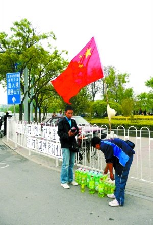 昨日下午,九棵樹地鐵站口北側(cè)的十字路口,陳進(jìn)和同伴俞洪帶著他們的可樂飲料,在人行道柵欄上又掛起他們的橫幅標(biāo)語(yǔ),這次,他們插上了一面鮮紅的國(guó)旗,在風(fēng)中招展。